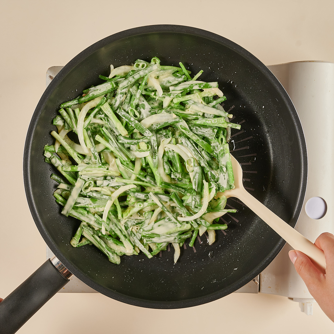 전을 부치기 바로 직전에 손질한 부추, 양파, 고추를 반죽에 넣고 가볍게 섞어 주세요.