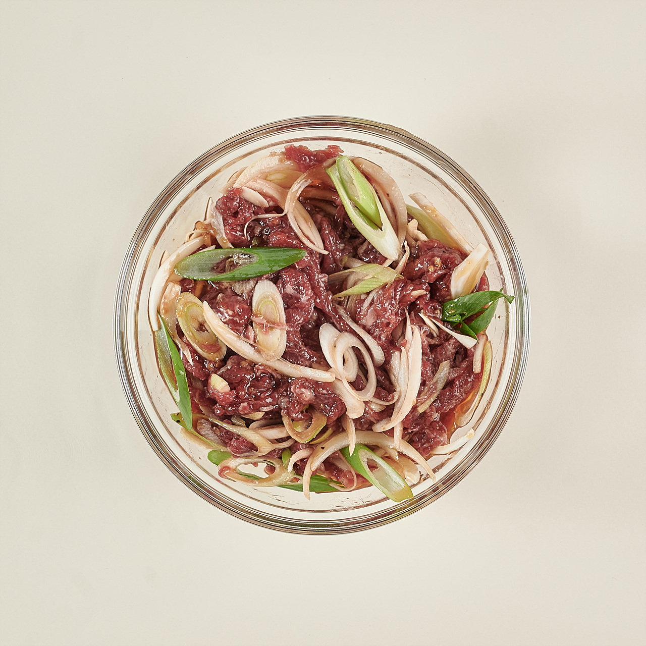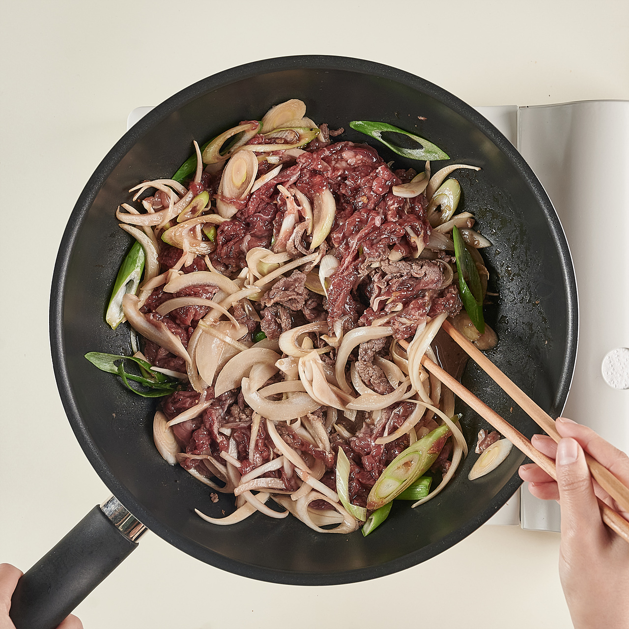 중불로 예열한 팬에 양념에 버무린 불고기를 넣고 고기가 완전히 익고 양파가 투명해질 때까지 7~10분 동안 볶으면 완성!