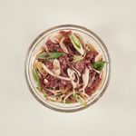 불고기용 고기를 4~5cm 크기로 썰어준 후, 샘표 조선불고기 양념을 넣고 1분 동안 버무려주세요. 고기에 손질한 채소를 넣고 양념이 골고루 묻도록 섞어주세요.