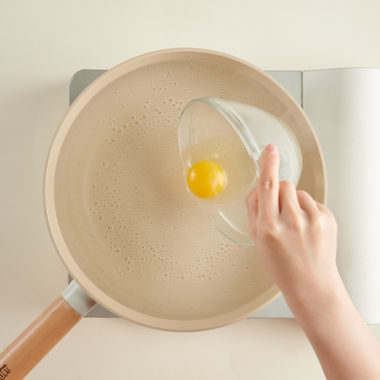 물이 끓어오르면 불은 끈 후, 약 30초 뒤에 달걀을 조심스럽게 넣어 약 2분을 기다려 주세요.