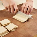 포두부는 한 장씩 떼어낸 뒤 사방 4cm 크기로 썰어주세요.