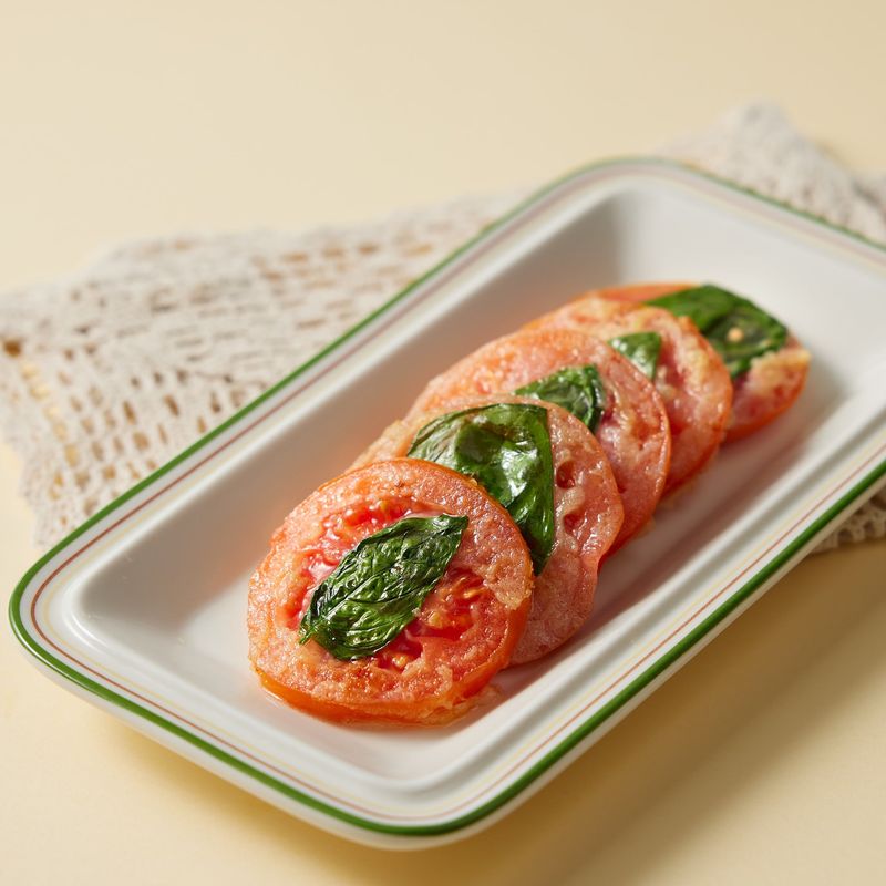 토마토는 1cm 두께로 원형썰기하고, 바질은 물로 세척 후, 한 잎씩 떼어내 주세요.