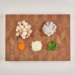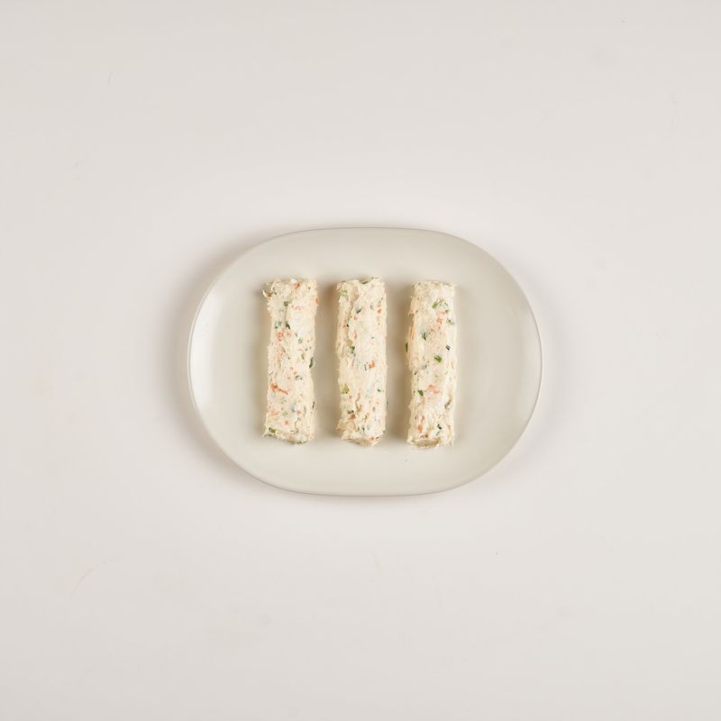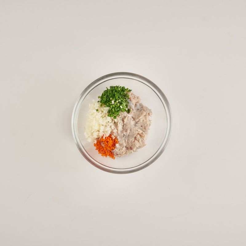 명태살, 새우살은 1cm 길이로 작게 썰어주세요. 당근, 양파, 부추는 곱게 다져 주세요.