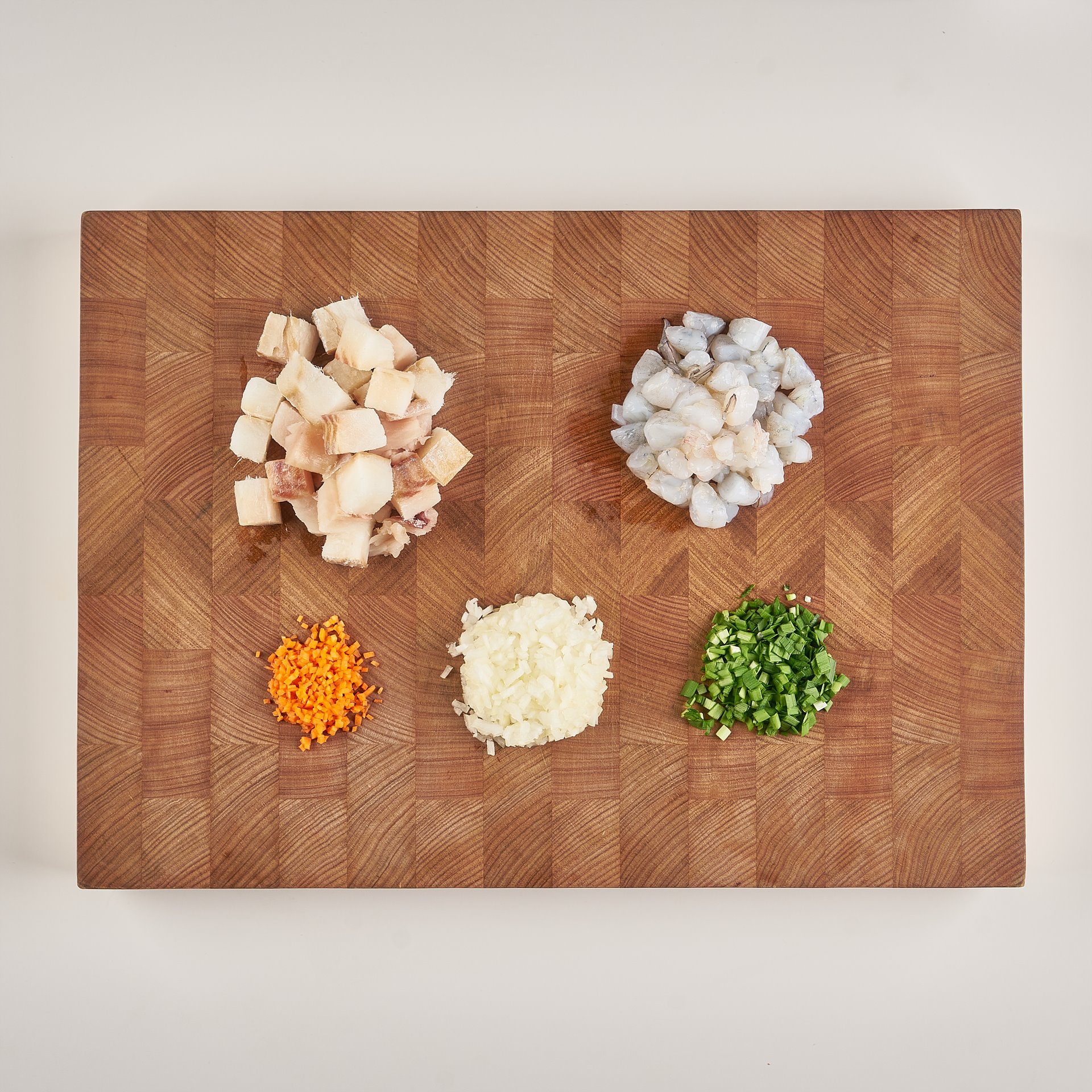 명태살, 새우살은 잘게 썰어주세요. 당근, 양파, 부추는 곱게 다져 주세요.