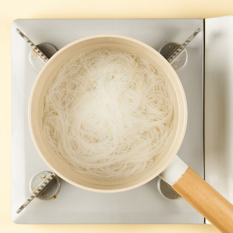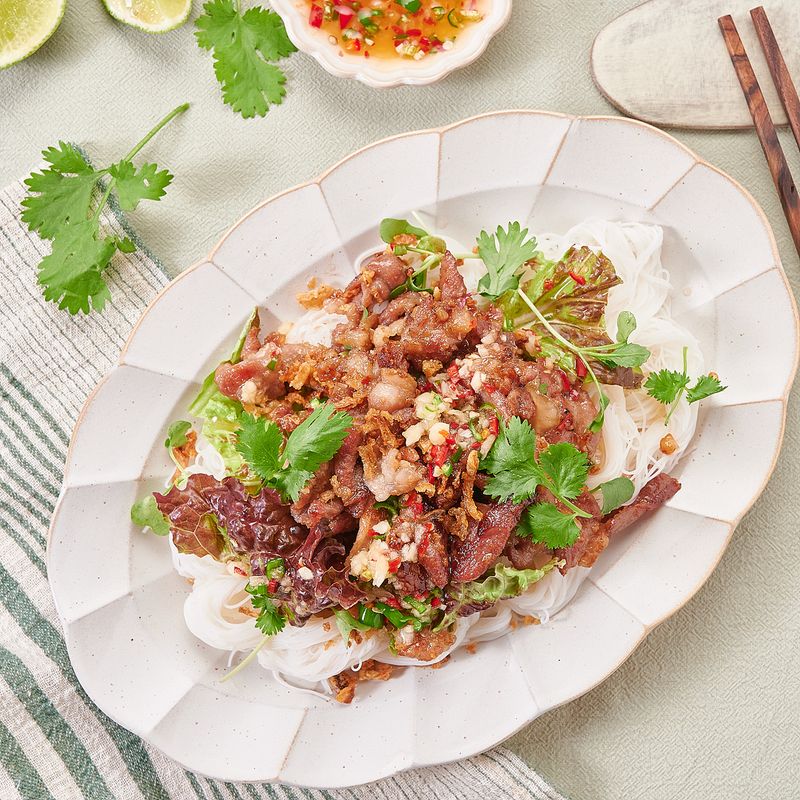 얇은 쌀국수면에 바싹 구운 돼지고기를