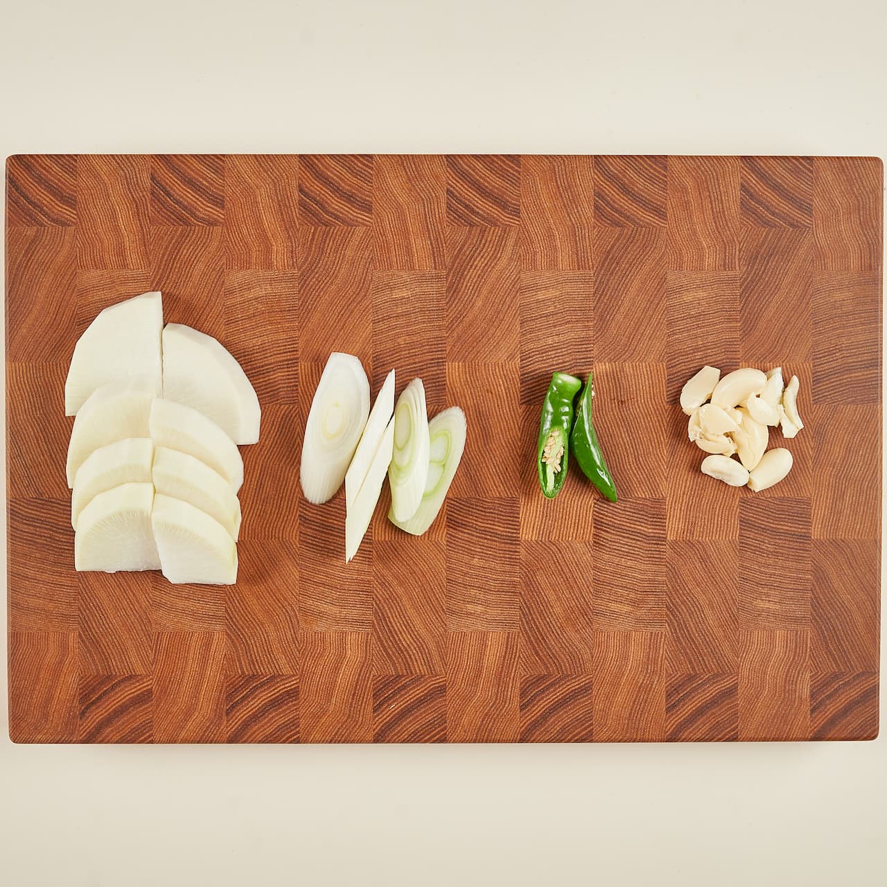무는 껍질을 제거한 후, 2cm 두께로 은행 썰기하고, 대파는 어슷 썰기, 청양고추는 반으로 잘라주세요. 마늘은 칼등으로 살짝 으깨 주세요.