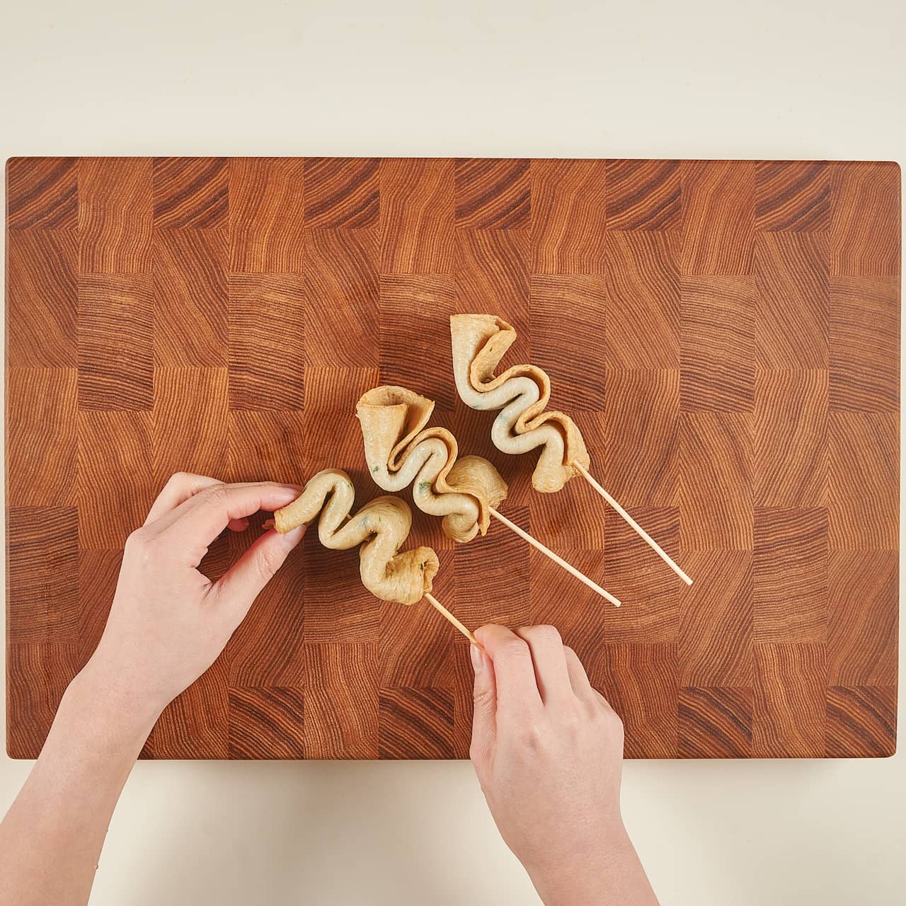 사각 어묵은 2번 접은 후, 지그재그로 나무꼬치에 끼워주세요.