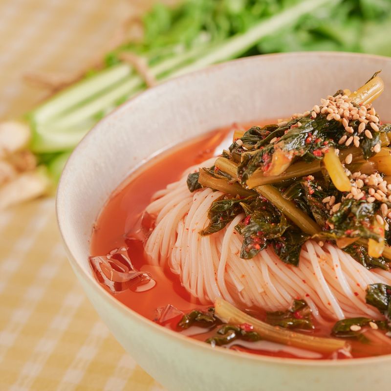 삶은 소면에 준비해둔 열무김치국물을 부은 후, 열무김치를 얹어주면 완성!