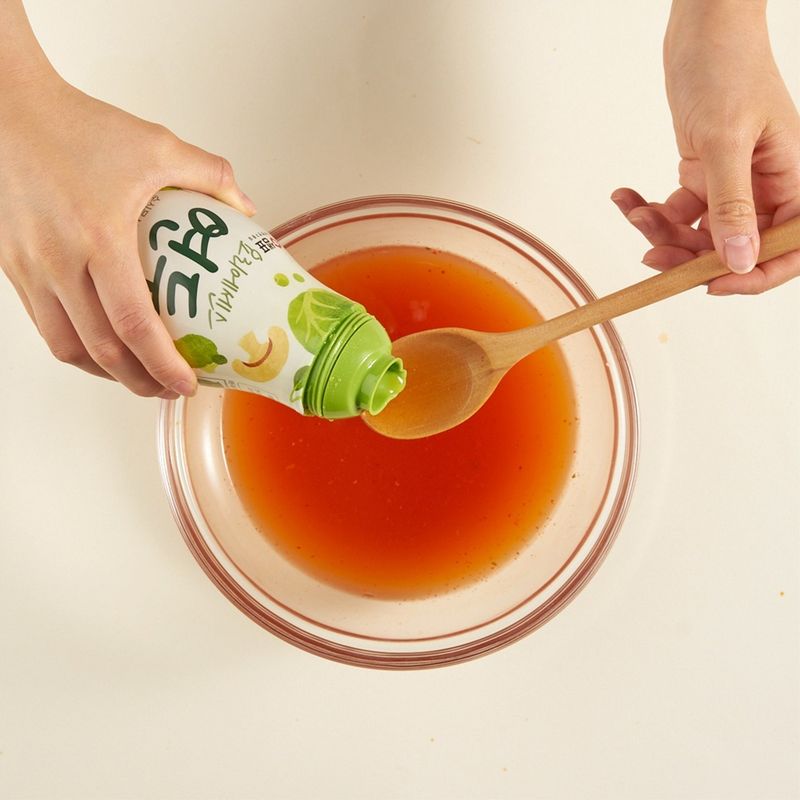 육수 재료(열무김치 국물과 물, 연두, 설탕, 식초)를 섞어 국물을 만든 후, 냉장고에서 차갑게 준비해주세요.