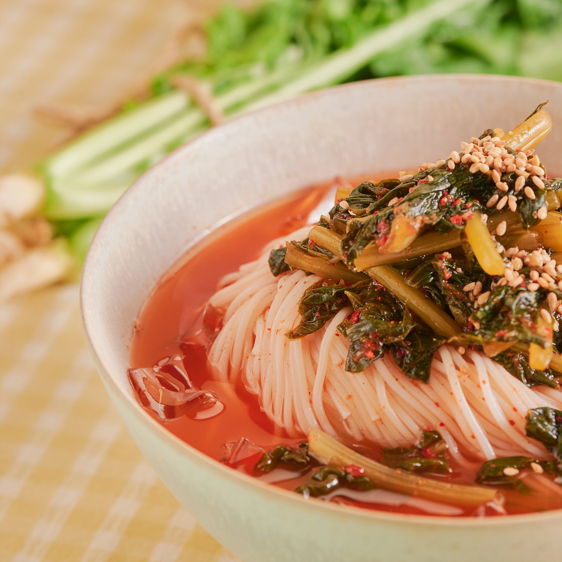 진공소면에 준비해둔 열무김치국물을 부은 후, 열무김치를 얹어주면 완성!