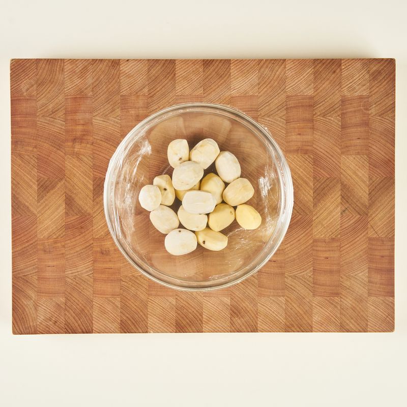 껍질을 깐 밤은 전자레인지용 용기에 넣고 랩을 씌워 4-5분간 조리해주세요. (1,000W 기준)